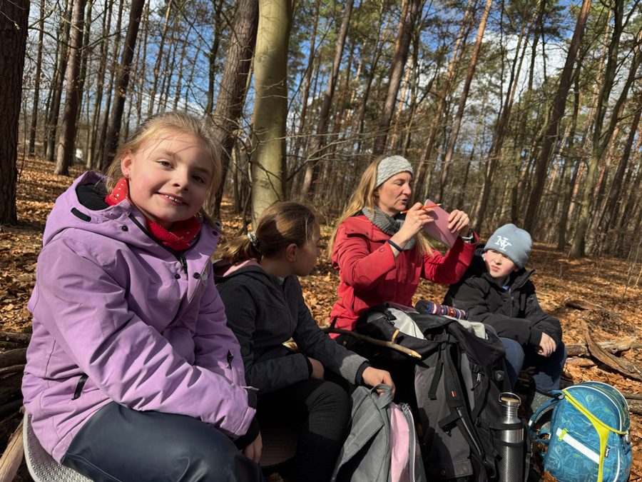 Für mich ist der Wald: Ich rieche Frühlingsluft. Ich höre das Knistern der Blätter. Ich fühle das Moos unter den Füßen. Ich sehe Füchse, Bäume, Vögel, Schmetterlinge und manchmal Frühblüher.