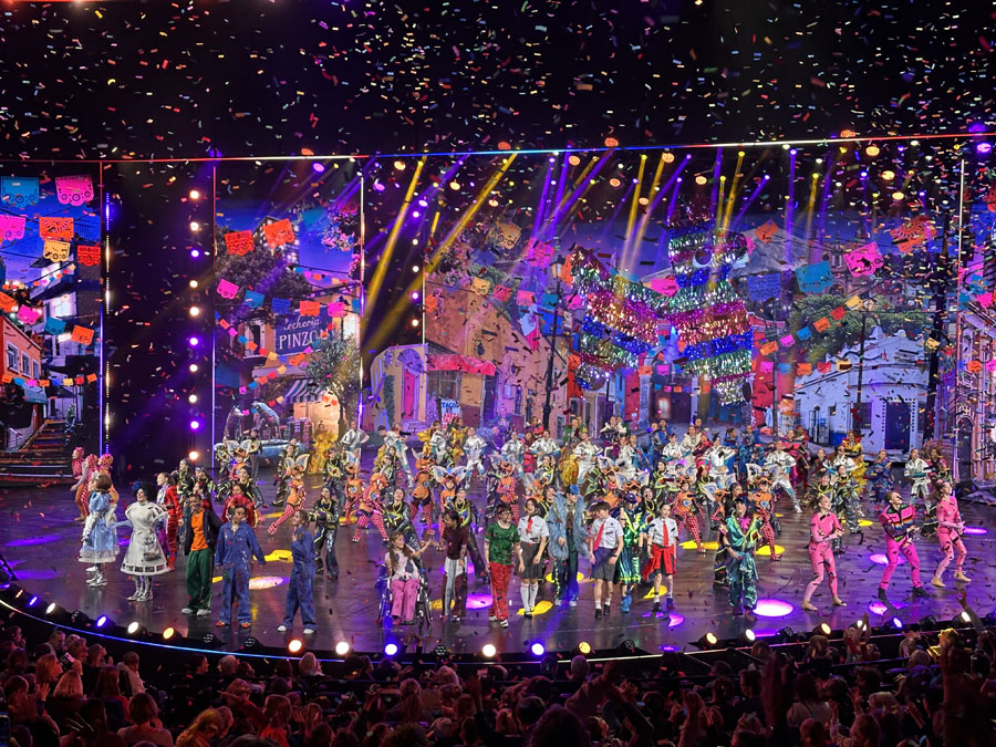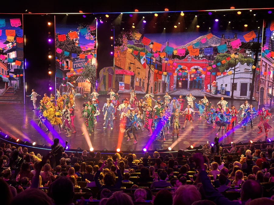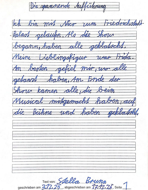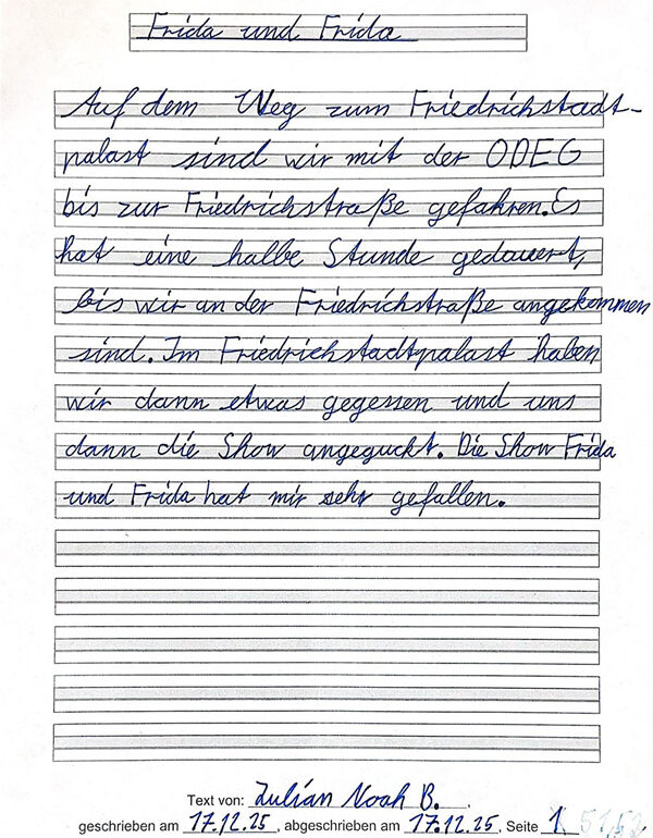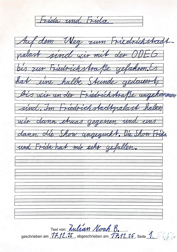 Kurz darauf folgte ein ganz besonderes Highlight: Die dritten Klassen besuchten die Kindershow „Frida & Frida“ im Friedrichstadt-Palast. Im farbenprächtigen Bühnenbild entdeckten die Kinder viele Elemente wieder, die sie bereits aus dem Kunstunterricht kannten – darunter auch die typischen Totenköpfe.