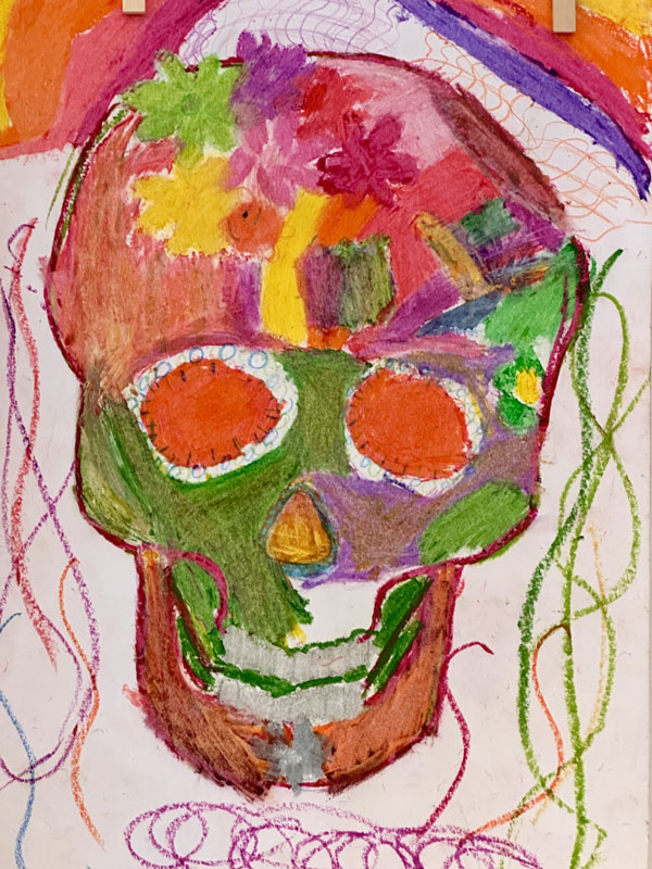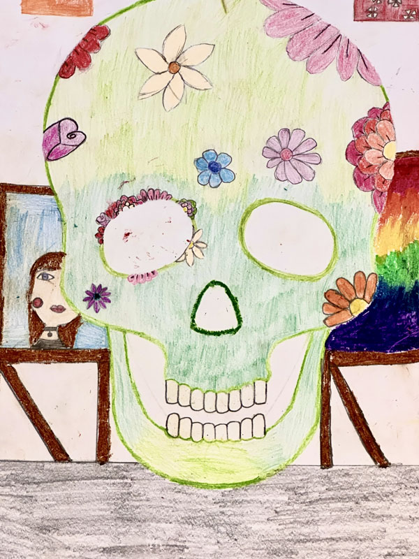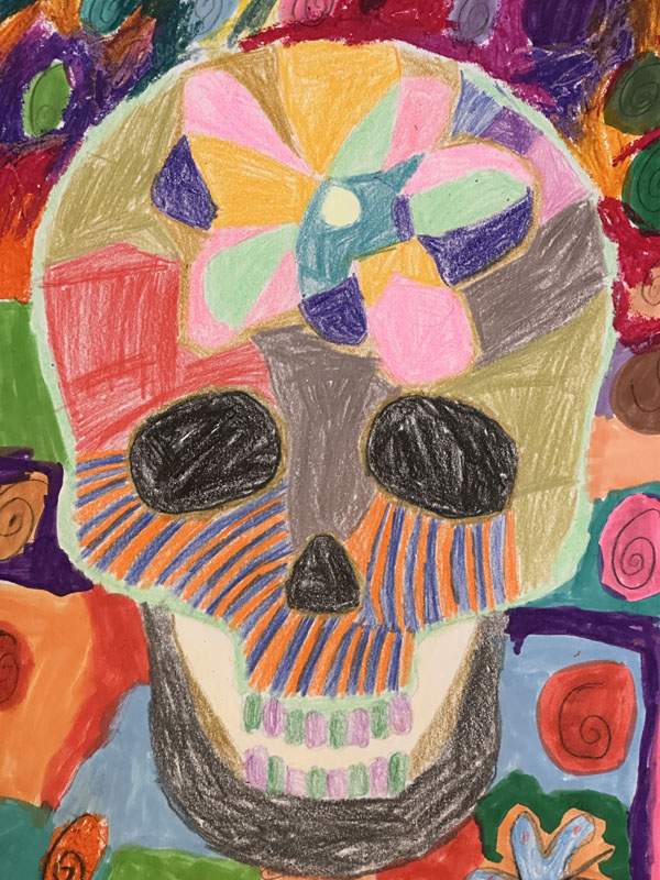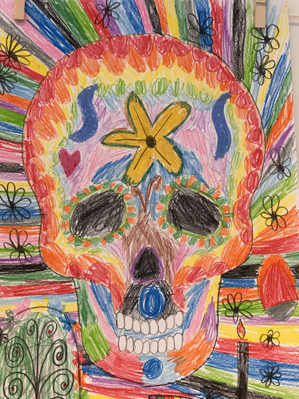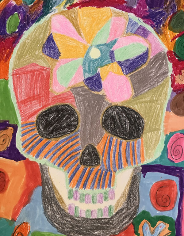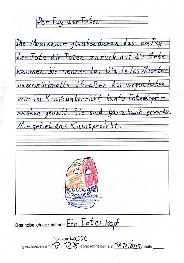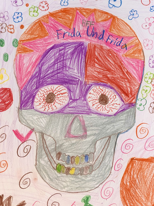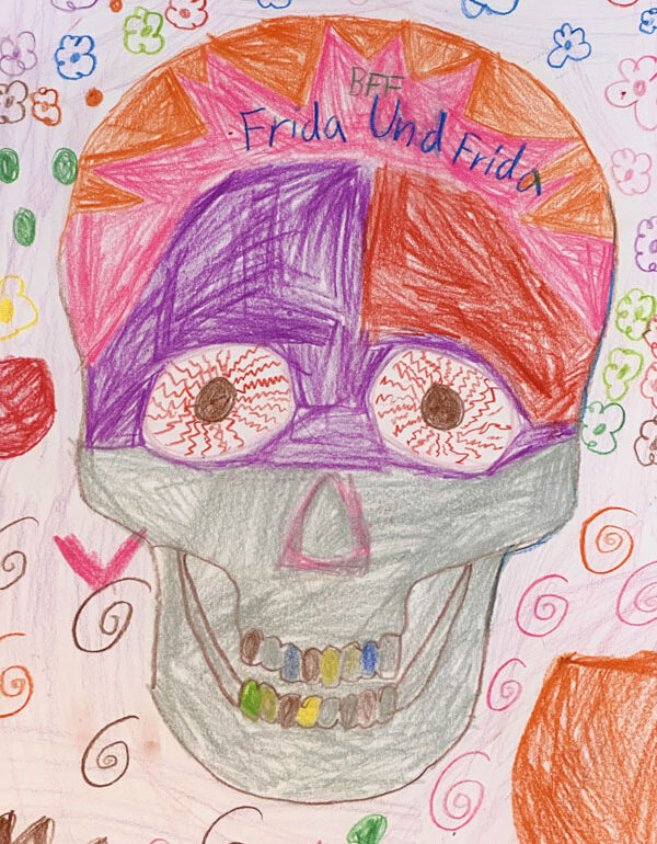 In den letzten Wochen drehte sich im Kunstunterricht der Klasse 3c alles um die Künstlerin Frida Kahlo. Die Kinder lernten sie mithilfe eines Bilderbuches kennen und erfuhren dabei auch, was der „Día de los Muertos“ bedeutet. Passend dazu gestalteten sie farbenfrohe, bunt verzierte Totenmasken.