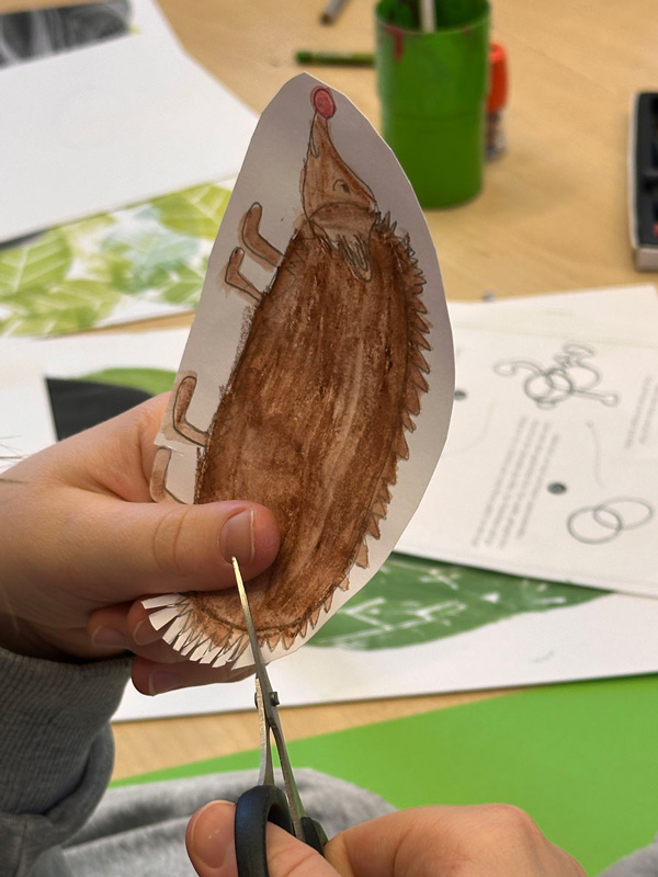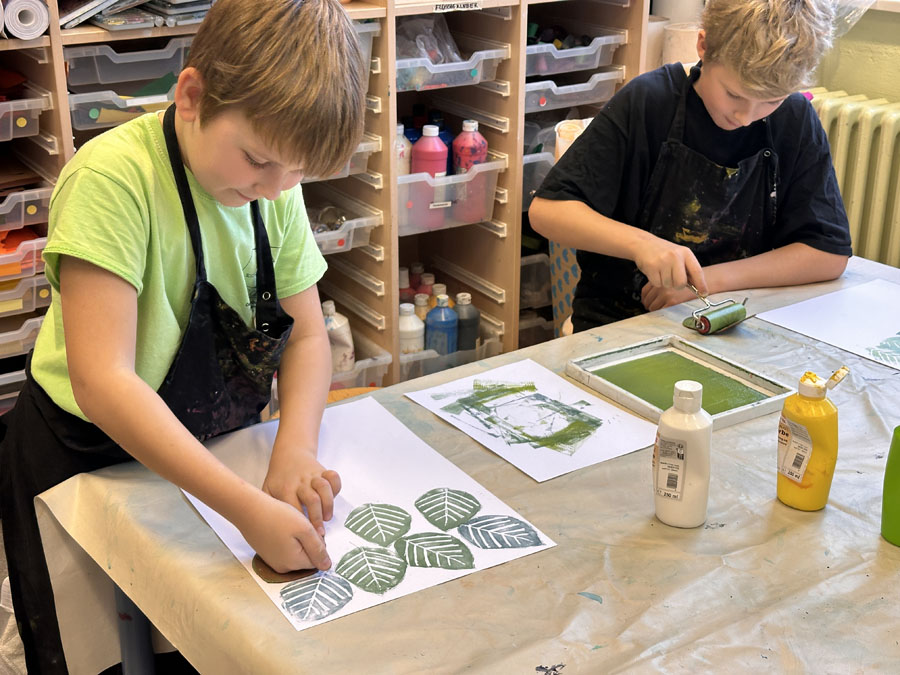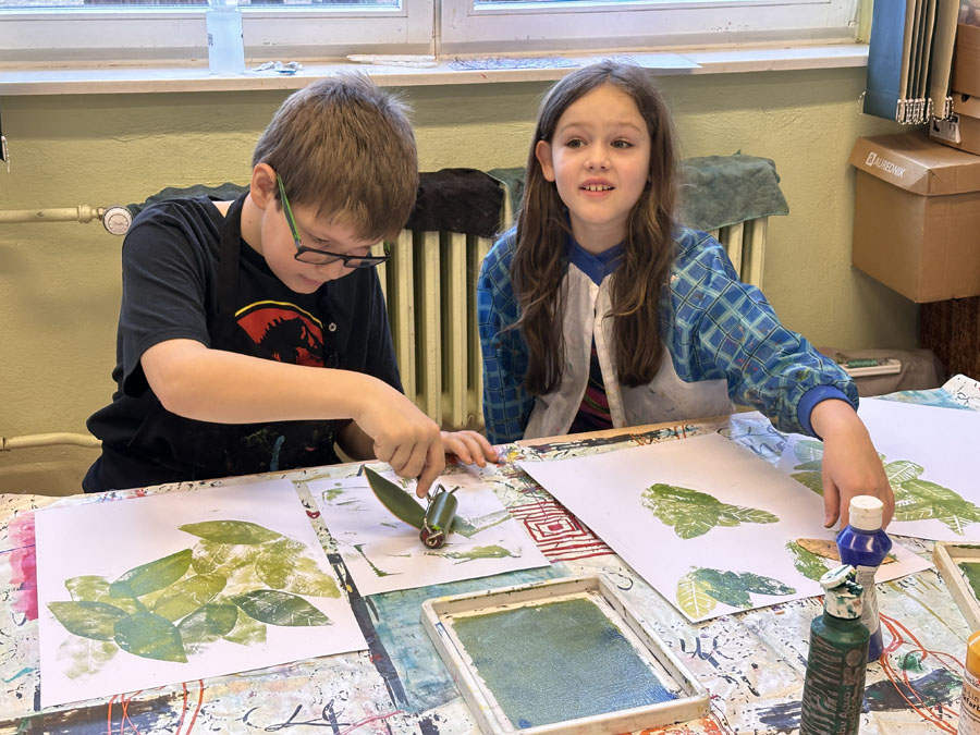 Zunächst gestalteten die Kinder mit selbst hergestellten Moosgummi-Stempeln einen Hintergrund aus verschiedenen Grüntönen.