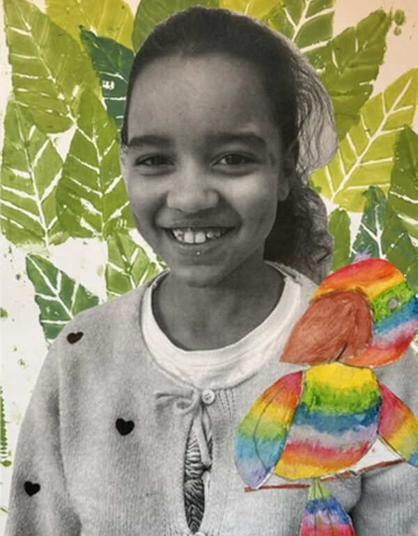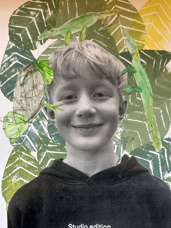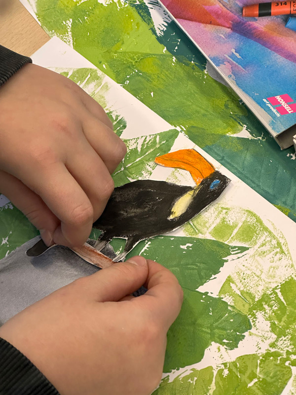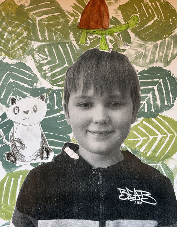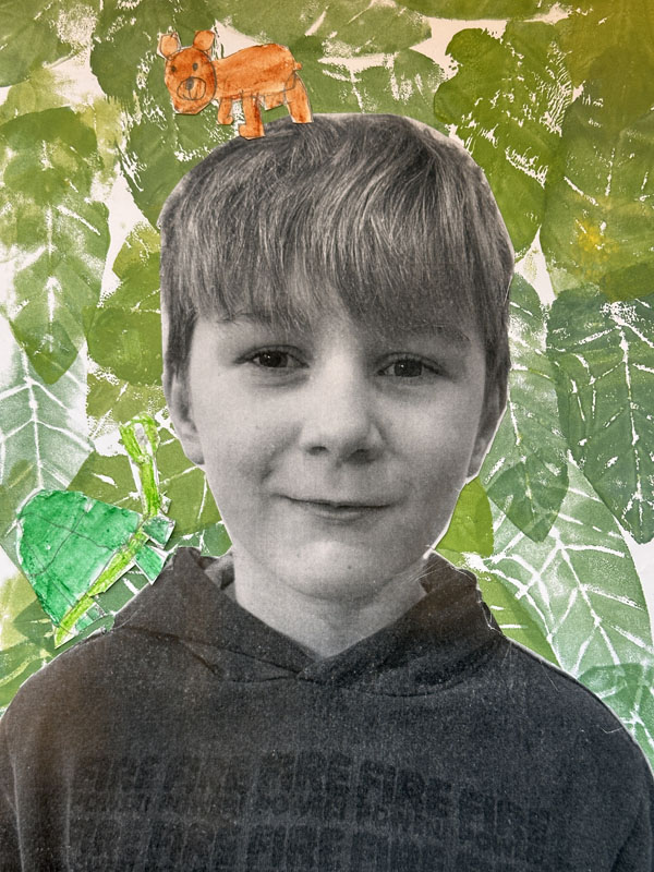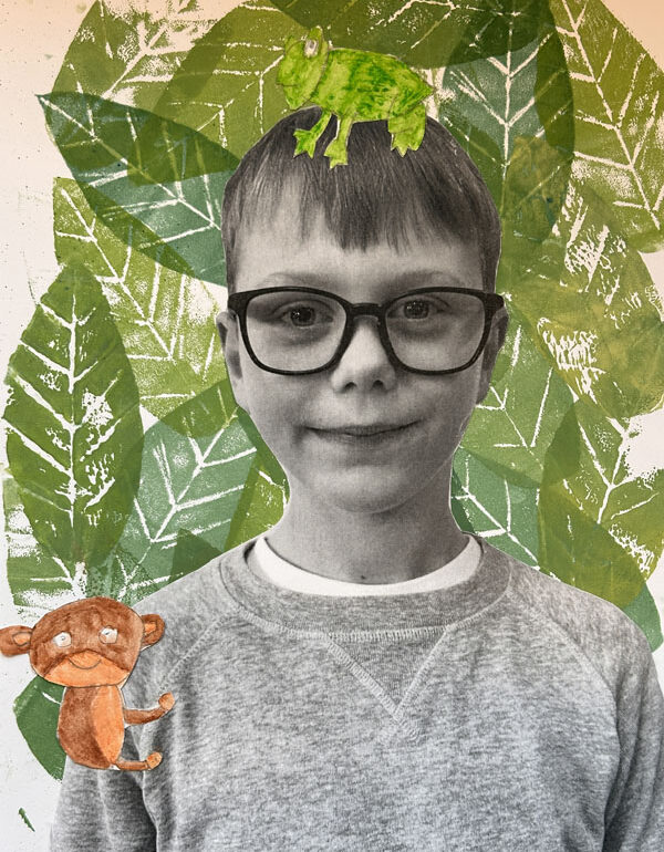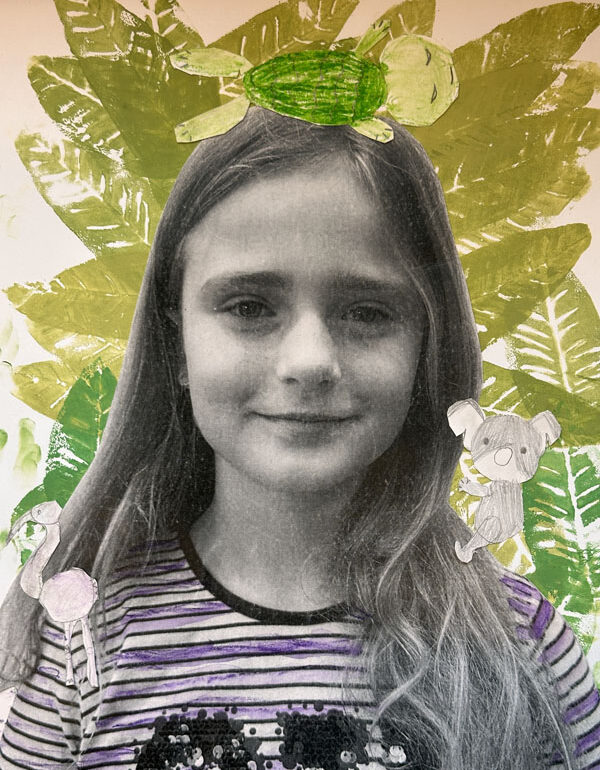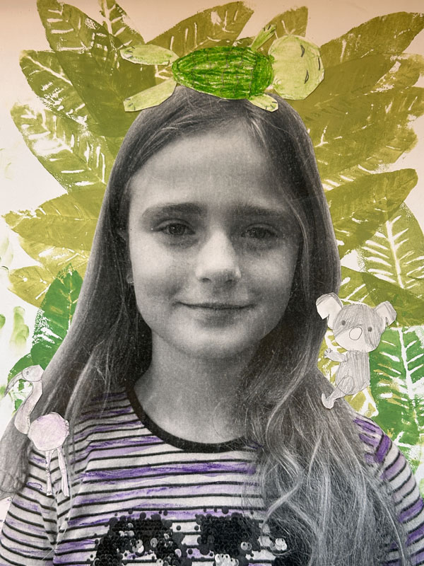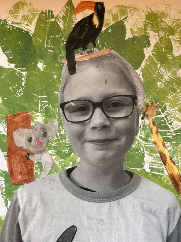 Anschließend schnitten sie ein groß ausgedrucktes Foto von sich selbst aus und klebten es auf den gestalteten Hintergrund. Damit das Bild noch stärker an Frida Kahlos Werke erinnerte, durften Tiere nicht fehlen: Die Kinder zeichneten verschiedene Tiere, schnitten sie aus und ergänzten damit ihr persönliches Selbstporträt.