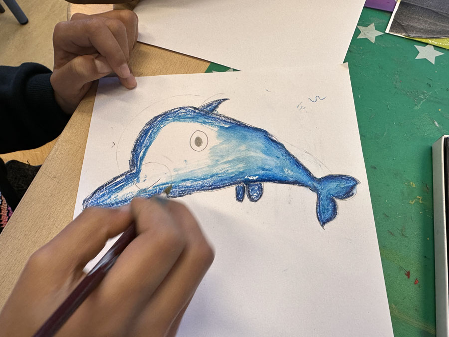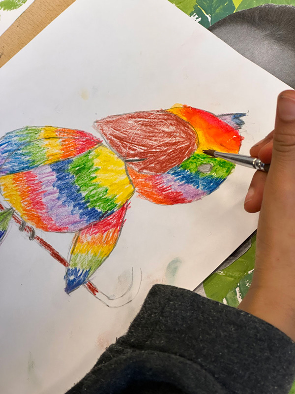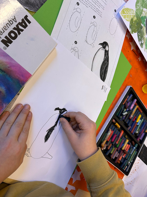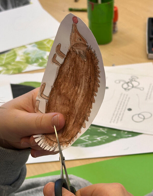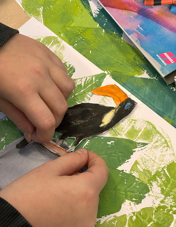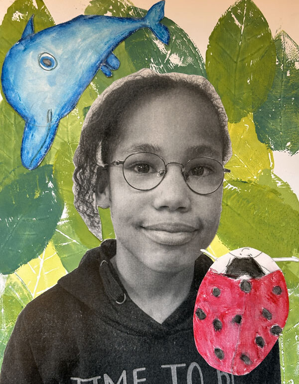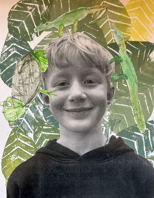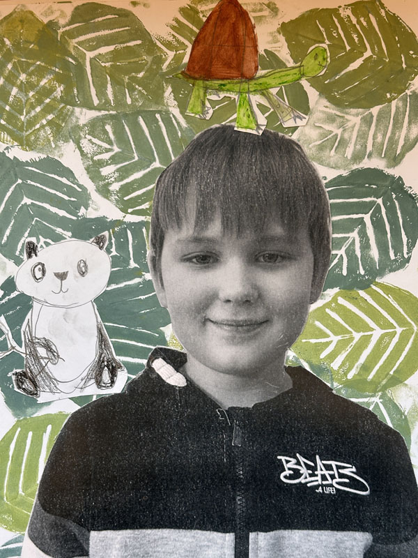 Anschließend schnitten sie ein groß ausgedrucktes Foto von sich selbst aus und klebten es auf den gestalteten Hintergrund. Damit das Bild noch stärker an Frida Kahlos Werke erinnerte, durften Tiere nicht fehlen: Die Kinder zeichneten verschiedene Tiere, schnitten sie aus und ergänzten damit ihr persönliches Selbstporträt.