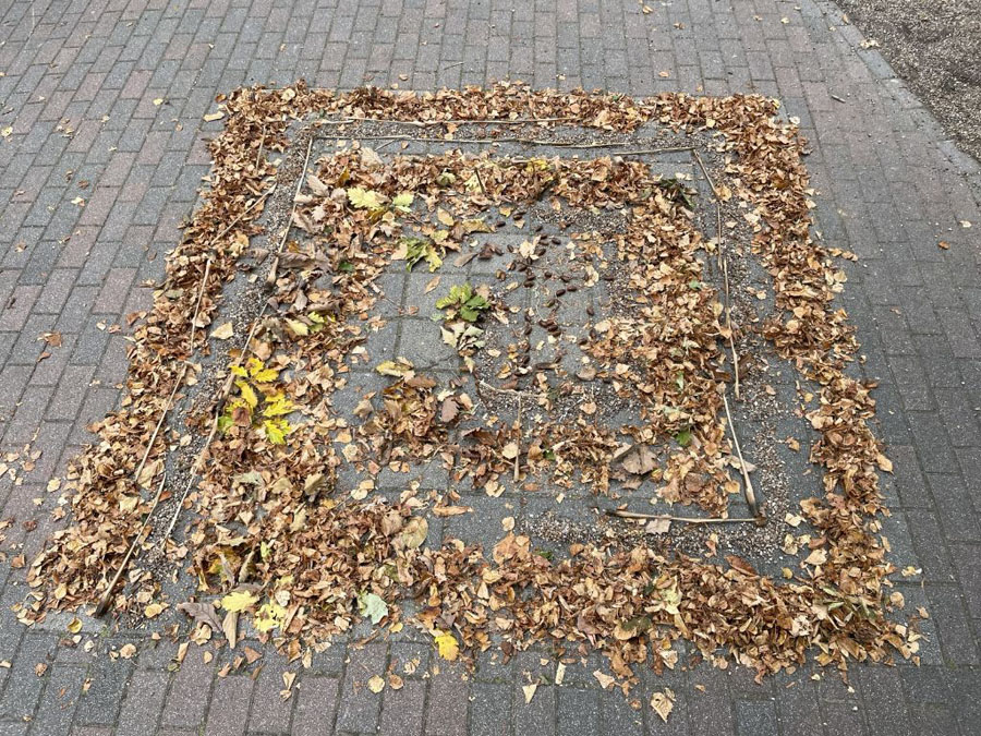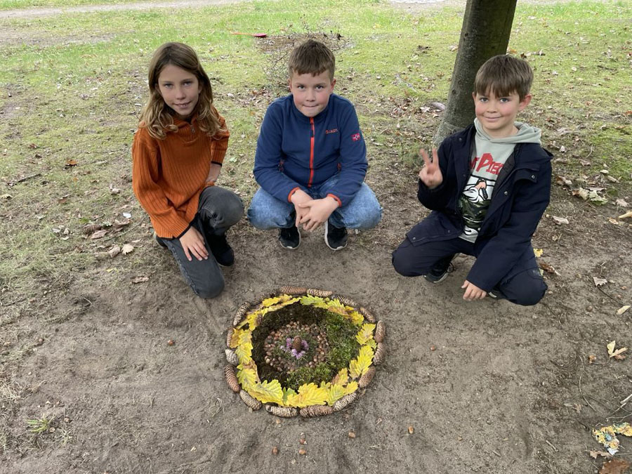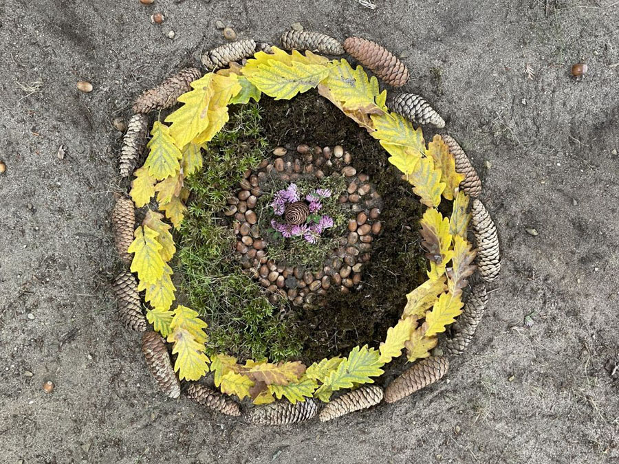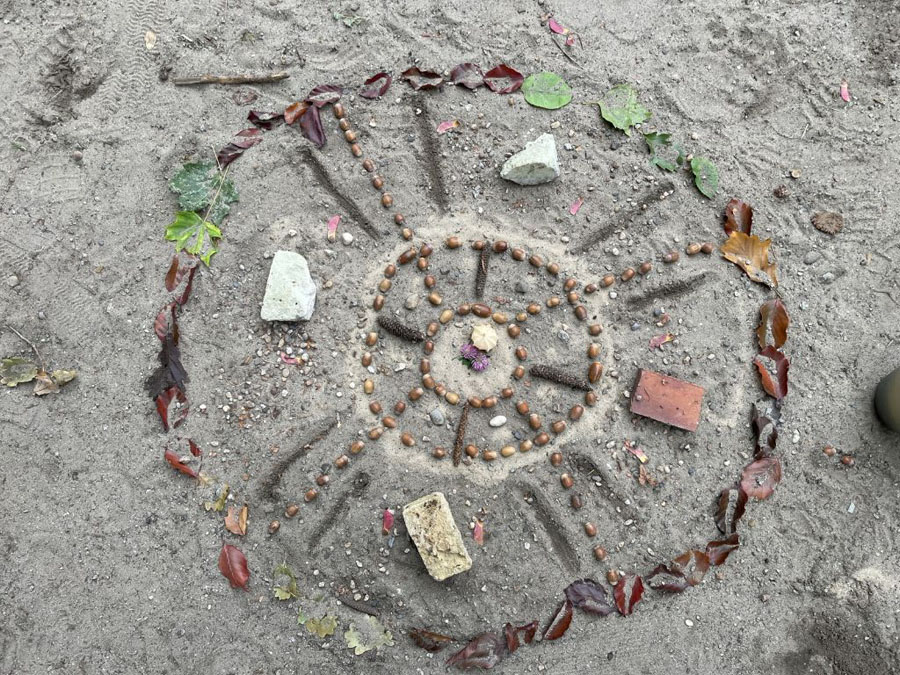 Es gab auch noch unsere Herbst-Mandalas. Dafür sind wir nach draußen gegangen und haben Materialien zusammengesucht – also Sand, Blätter, Schaufeln, Eicheln und so weiter. Damit haben wir dann Mandalas gelegt. Es kamen sehr viele Meisterwerke dabei heraus.