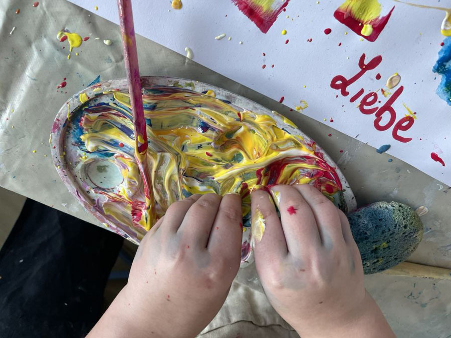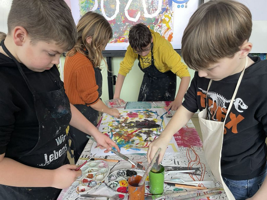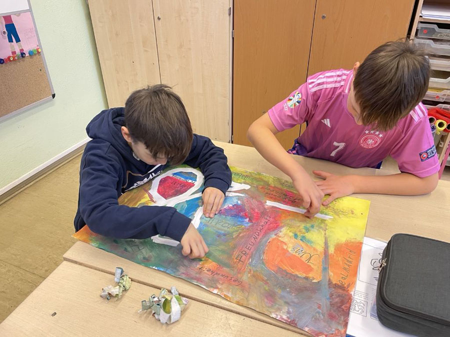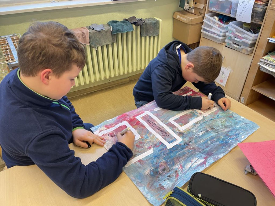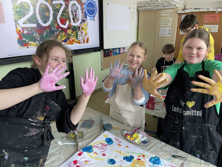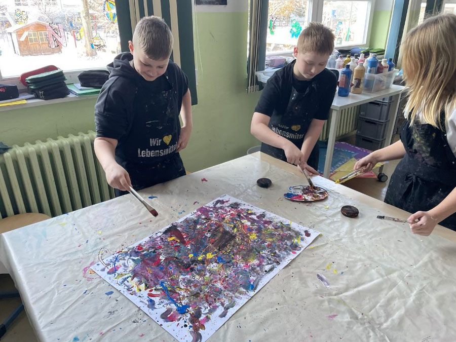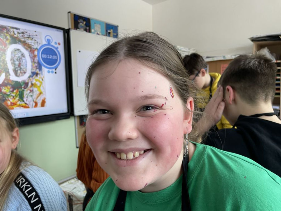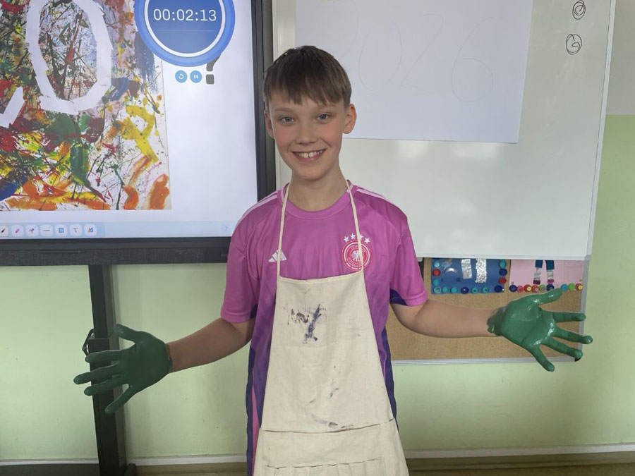 Wir haben unsere Spritzbilder gemacht. Dabei haben wir auf ein A3-Blatt „2026“ geschrieben, dann drumherum ein paar Worte und unsere Namen ergänzt. Danach haben wir die „2026“ abgeklebt und alles wild mit Farbe bespritzt.