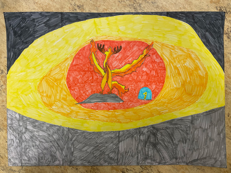 Mein Tier ist ein Feuerdrache mit einem Elchgeweih und es kann Lavaattacken schießen.