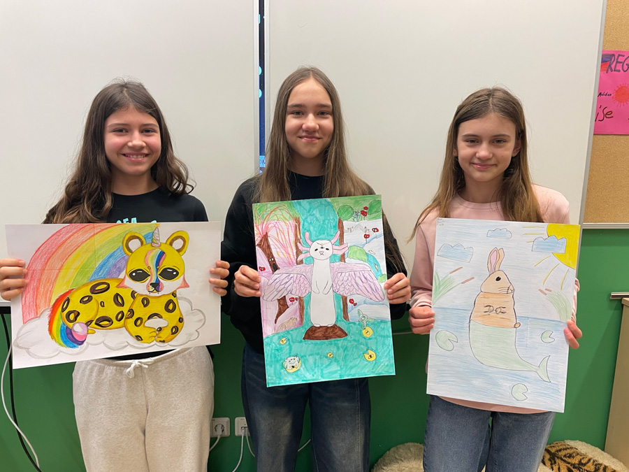Im Kunstunterricht haben die Schülerinnen und Schüler ihrer Fantasie freien Lauf gelassen: Aus zwei oder drei Tieren entstanden völlig neue, einzigartige Fabelwesen. Mit Farben, Stiften und viel Kreativität wurden nicht nur fantasievolle Bilder gestaltet, sondern auch Steckbriefe und Geschichten zu den erfundenen Wesen geschrieben.